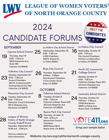 Additionally, the college campus is invited to the League of Women Voters of North Orange County candidate forums in their communities, including two forums hosted on our campus for the Fullerton School District and the North Orange County Community College District candidate forums.