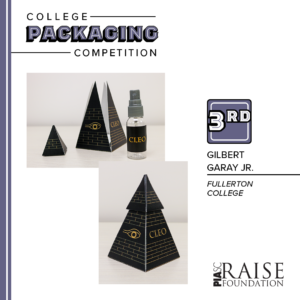 Fullerton College Printing and Design student Gilbert Garay, Jr. recently competed in Printing Industries Association, Inc. of Southern California’s (PIASC) R.A.I.S.E. Foundation’s annual competition and took home a 3rd place award in the College Packaging Competition.